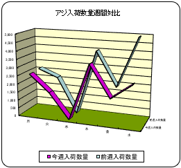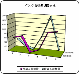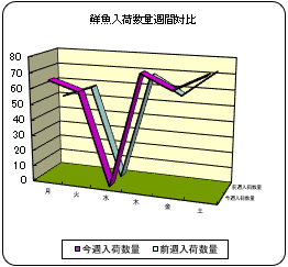 【概況】今今週の鮮魚入荷量は前週比9%増、前年比8%減の334d。主要魚種別ではイワシとサケが前週、前年比とも増加。ブリとキンメは増加も前年比減少。スルメは減少も前年比増加。サバ、タラ、カキは両比率とも減少相場は全般に堅調。 【イワシ】三重等より入荷。前週比17%増、前年比79%増も低水準。 【カツオ】鹿児島、和歌山等より入荷。前週比65%減、前年比4倍増もごく低位。相場は高値推移。 【サバ】ごく少量の入荷。前週比42%減、前年比62%減。品薄高値推移。 【アジ】長崎、鳥取、富山、和歌山、千葉等より入荷。前週比26%減、前年比13%減。中型は1.5割安。 【スルメイカ】岩手、静岡等より入荷。前週比18%減、前年比2.4倍増。