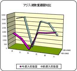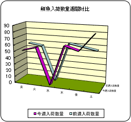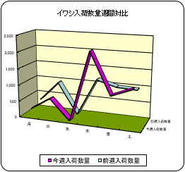 【概況】今週の鮮魚入荷量は前週比9%増、前年比1%減の311d。主要魚種別ではサケ、サンマ、スルメ、タラ、サワラが前週、前年比とも増加。イワシとブリは増加も前年比減少。カツオ、サバ、アジは両比率とも減少。カツオとアジが高値。サンマは軟調。 【イワシ】千葉、北海道等より入荷。前週比16%増、前年比41%減。相場は1.5割安。 【カツオ】千葉、鹿児島等より入荷。前週比15%減、前年比69%減。千葉3k上は更に1.5割の超高値。 【サバ】神奈川、宮城等より入荷。前週比15%減、前年比52%減。相場は高値推移。 【アジ】長崎、鳥取、神奈川等より入荷。前週比36%減、前年49%減比。中型は2倍高。 【スルメイカ】青森、北海道、宮城等より入荷。前週比18%増、前年比48%増。釣物25入りは1.5割高。小型5k箱は1割安。