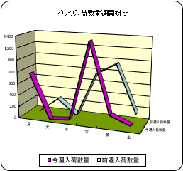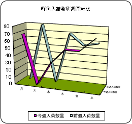 【概況】今週は開市日数が前週より1日多く、前週比4%増、前年比13%増の276d。主要魚種別ではイワシ、アジ、サケが前週、前年比とも増加。カツオとブリは増加も前年比減少。サバ、サンマ、スルメは減少も前年比増加。相場はサンマの上昇が目立った。 【イワシ】北海道、千葉等より入荷。前週比14%増、前年比20%増。低水準の入荷で相場は保合。 【カツオ】鹿児島等より入荷。前週比23倍増も前年比50%減。相場は高値で保合。 【サバ】神奈川、静岡等より入荷。前週比23%減、前年比13%増。マサバは低調高値。ゴマは0.5割安。 【アジ】長崎、福岡、佐賀、島根、鳥取、神奈川等より入荷。前週比21%増、前年比10%増。中型は1割安。 【スルメイカ】青森、宮城等より入荷。前週比34%減も前年比44%増。釣物25入りは2割高。
