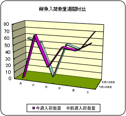 【概況】今週の鮮魚入荷量は前週比11%減、前年比13%減。主要魚種別ではイワシ、ブリ、タラが前週、前年比とも増加。カツオとアジは増加も前年比減少。サケ、サンマ、スルメは減少も前年比増加。相場は全般に軟調。 【イワシ】北海道、愛知、鹿児島等より入荷。前週比2.7倍増、前年比2.1倍増も低水準。相場は高値推移。 【カツオ】鹿児島、千葉、神奈川等より入荷。前週比12%増も前年比52%減。鹿児島の4k台は1.5割安。 【サバ】新潟、宮城、岩手等より入荷。前週比14%減、前年比59%減。マサバ少なく、ゴマは1割高。 【アジ】長崎、佐賀、鳥取、石川、三重、神奈川等より入荷。前週比15%増、前年比15%減。中型は2.5割安。 【スルメイカ】北海道、青森等より入荷。前週比26%減、前年比63%増。釣物25入りは保合。
