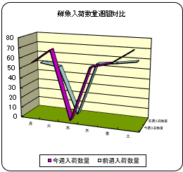 【概況】今週の鮮魚入荷量は前週比16%増、前年比21%増の313d。主要魚種別ではサバ、タラ、キンメ、アジ、サケ、サンマ、カキが前週、前年比とも増加。ブリとスルメは増加も前年比減少。カツオは両比率とも激減。相場は全般に軟調。 【イワシ】北海道、愛知、鹿児島等より入荷。前週比27%減で前年と同量。愛知の小羽は1割安も北海道、鹿児島の大中羽は高値。 【カツオ】鹿児島等より少量入荷。前週比60%減、前年比86%減。品薄超高値。 【サバ】神奈川等より入荷。前週比6%増、前年比12%増。ゴマ主体で相場は保合。 【アジ】長崎、福岡、島根、鳥取、三重、千葉等より入荷。前週比3%増、前年比7%増。中型は1割安。 【スルメイカ】北海道等より入荷。前週比20%増も前年比14%減。相場は高値圏継続。