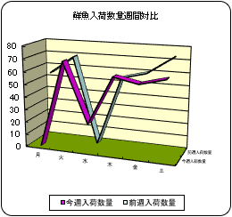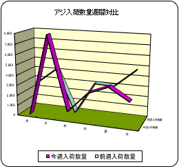 【概況】今週の鮮魚入荷量は前週比15%減、前年比14%減の267d。主要魚種別ではイワシとタラは増加も前年比減少。サワラ、サケ、アジは減少も前年比増加。カツオ、サバ、ブリ、カキは両比率とも減少。相場は全般に保合。 【イワシ】北海道、鹿児島等より入荷。前週比68%増、前年比8%減。北海道の2K箱は0.5割安。 【カツオ】鹿児島等より少量入荷。前週比10%減、前年比83%減。品薄高値。 【サバ】神奈川、千葉、新潟、富山、鳥取等より入荷。前週比22%減、前年比34%減。ゴマ主体で1.5割高。 【アジ】長崎、福岡、和歌山、三重、富山、神奈川等より入荷。前週比3%減で前年と同量。中型は1割高。 【スルメイカ】青森等より入荷。前週と同量で前年比20%増。相場は2割安。