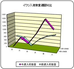 【概況】今週の鮮魚入荷量は前週比15%減、前年比14%減の267d。主要魚種別ではイワシとタラは増加も前年比減少。サワラ、サケ、アジは減少も前年比増加。カツオ、サバ、ブリ、カキは両比率とも減少。相場は全般に保合。 【イワシ】北海道、鹿児島等より入荷。前週比68%増、前年比8%減。北海道の2K箱は0.5割安。 【カツオ】鹿児島等より少量入荷。前週比10%減、前年比83%減。品薄高値。 【サバ】神奈川、千葉、新潟、富山、鳥取等より入荷。前週比22%減、前年比34%減。ゴマ主体で1.5割高。 【アジ】長崎、福岡、和歌山、三重、富山、神奈川等より入荷。前週比3%減で前年と同量。中型は1割高。 【スルメイカ】青森等より入荷。前週と同量で前年比20%増。相場は2割安。
