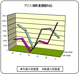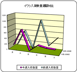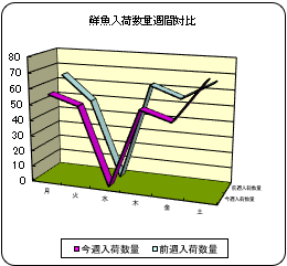 【概況】今週の鮮魚入荷量は前週比7%減、前年比1%減の274d。伊豆諸島を通過した台風22号の影響で大シケ。主要魚種別ではサケが前週、前年比とも増加。サバ、ブリ、タラは増加も前年比減少。サンマは減少も前年比増加。イワシ、カツオ、アジは両比率とも減少。相場は全般高。 【イワシ】鹿児島等より入荷。前週比39%減、前年比48%減。品薄で鹿児島の航空便は超高値。 【カツオ】鹿児島等より入荷。前週比8%減、前年比27%減。相場は3〜4k台1入れは3割高。 【サバ】岩手等より入荷。前週比5%増も前年比48%減。マサバは少なく、ゴマは2割高。 【アジ】長崎、鳥取、三重、静岡、神奈川等より入荷。前週比26%減、前年比20%減。中型は5割高。 【スルメイカ】青森、宮城、千葉等より入荷。前週比18%減で前年並み。青森の釣物25入りは1.5割高。
