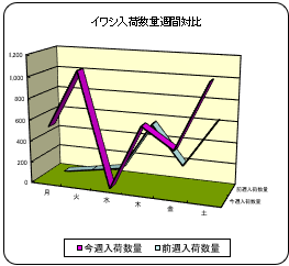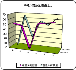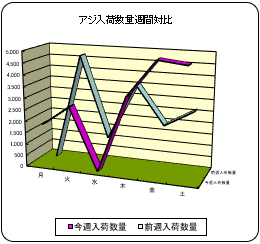 【概況】今週の鮮魚入荷量は前週比5%増、前年比13%減の269d。主要魚種別ではイワシ、タラ、アジ、サケが前週、前年比とも増加。サバ、サンマ、サワラ、カキは増加も前年比減少。カツオ、ブリ、スルメは両比率とも減少。相場は全般に保合。 【イワシ】愛知、鹿児島等より入荷。前週比2.5倍増、前年比16%増も低水準。相場は1.5割安。 【カツオ】鹿児島、千葉等より入荷。前週比32%減、前年比52%減。鹿児島の4k台は2割高。 【サバ】神奈川等より入荷。前週比2倍増も前年比31%減。ゴマ主体で相場は保合。 【アジ】長崎、山口、島根、鳥取、和歌山、千葉、神奈川等より入荷。前週比26%増、前年比5%増。中型は1割安。 【スルメイカ】北海道、青森等より入荷。前週比37%減、前年比72%減。品薄高値推移。