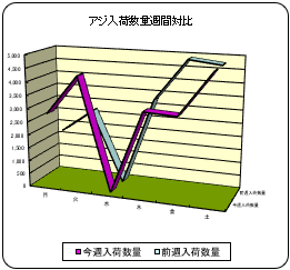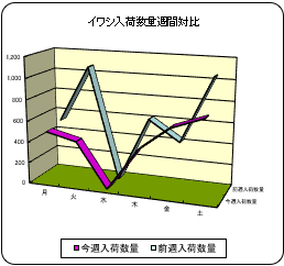 【概況】今週の鮮魚入荷量は前週比16%増、前年比21%増の313d。主要魚種別ではサバ、タラ、キンメ、アジ、サケ、サンマ、カキが前週、前年比とも増加。ブリとスルメは増加も前年比減少。カツオは両比率とも激減。相場は全般に軟調。 【イワシ】北海道、愛知、鹿児島等より入荷。前週比27%減で前年と同量。愛知の小羽は1割安も北海道、鹿児島の大中羽は高値。 【カツオ】鹿児島等より少量入荷。前週比60%減、前年比86%減。品薄超高値。 【サバ】神奈川等より入荷。前週比6%増、前年比12%増。ゴマ主体で相場は保合。 【アジ】長崎、福岡、島根、鳥取、三重、千葉等より入荷。前週比3%増、前年比7%増。中型は1割安。 【スルメイカ】北海道等より入荷。前週比20%増も前年比14%減。相場は高値圏継続。